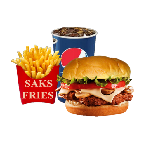 A mouth full of cooked Angus Beef weighing 1/4 LB, topped with Mushrooms, American Cheese and your choice of condiments. Served on a buttery toasted bun. with fries & Drink