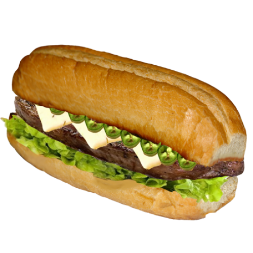 Did you say Blackened? Our rib eye steak cooked in Blackened Seasoning, topped with Pepper Jack Cheese on a toasted roll and pickle spear. Plus your choice of condiments